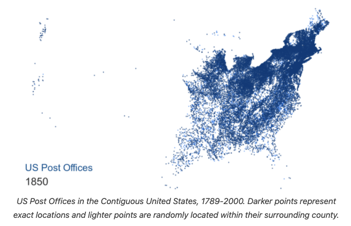 US Post Offices is a spatial-historical dataset containing records for 166,140 post offices that operated in the United States between 1639 and 2000. The dataset provides a year-by-year snapshot of the national postal system over multiple centuries, making it one of the most fine-grained and expansive datasets currently available for studying the historical geography of the United States